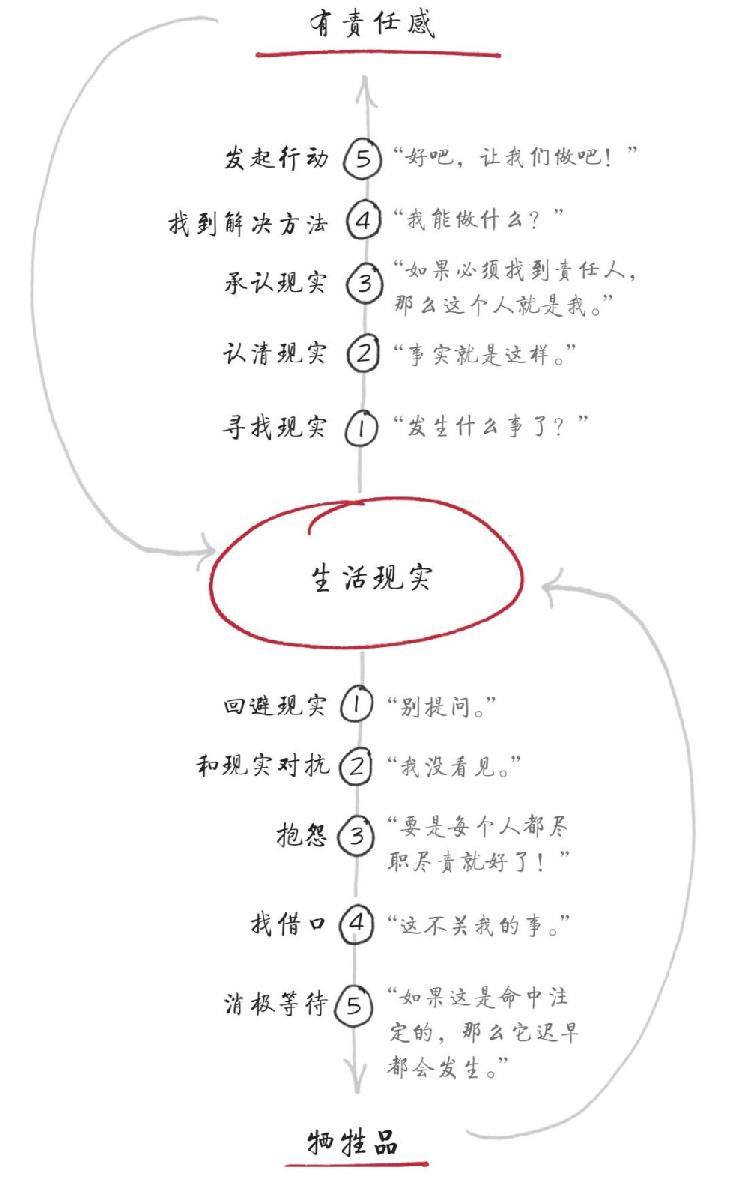 确实,“牺牲品”是一个很重的词。请注意,我们在讨论一种态度,而非某个人,尽管时间久了两者就会合二为一。没有谁天生就是牺牲品,这只是一种态度或方法。但如果坚持下去,负责任就会成为你的一种习惯。任何人在任何时候都可以担负起责任。责任越大,它就越有可能成为一个人面对困境时自然而然采用的方法。