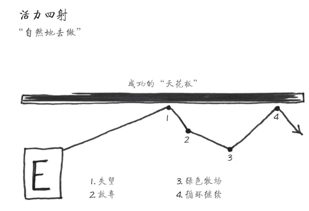 如果“E”是我们唯一的方法,我们就是在为成功人为地制造限制。如果我们使用“E”方法,然后到达了成功“天花板”,我们就会一次又一次碰壁,但永远无法超越。这种状态导致我们无法忍受失落,最终另辟蹊径。当我们认为自己已经发挥了最大潜能,考虑如何前进时,这个问题就变成一种恶性循环——在做下一件事时又重新焕发出热情和努力,之后再次碰到“天花板”、再次失望、再次放弃,然后又转向他方。