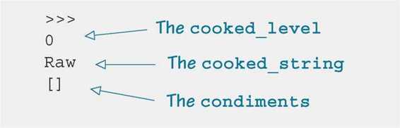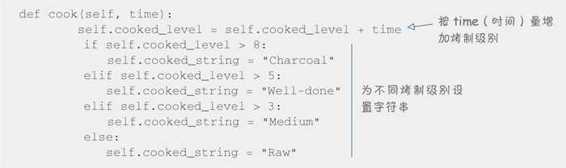 class HotDog: def __init__(self):self.cooked_level = 0self.cooked_string = "Raw"self.condiments = def cook(self, time):self.cooked_level = self.cooked_level + timeif self.cooked_level > 8: self.cooked_string = "Charcoal"elif self.cooked_level > 5: self.cooked_string = "Well-done"elif self.cooked_level > 3: self.cooked_string = "Medium"else: self.cooked_string = "Raw"myDog = HotDogprint myDog.cooked_levelprint myDog.cooked_stringprint myDog.condiments