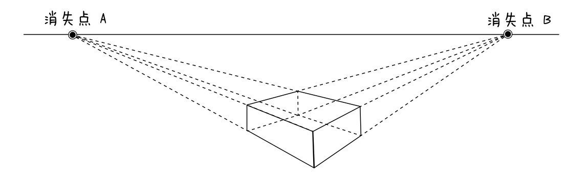 成角透视也叫“两点透视”,即物体向视平线的某两点消失。两点透视法是指视平线上有两个消失点,所绘制的立体结构(如下图所示)有两个消失点,两个面都用斜线绘制,强调了进深感。