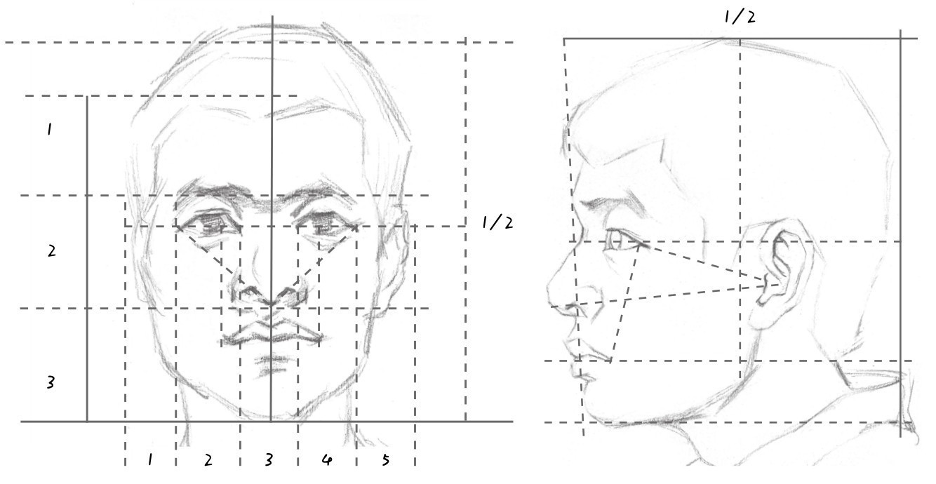头骨由脑颅骨骼和面颅骨骼构成,额骨、顶骨、颞骨、枕骨等构成坚固的球形脑颅骨骼,鼻骨、颧骨、上颌骨、下颌骨等构成面颅骨骼,其中只有下颌骨是可以活动的。头部骨骼的形态与细节都会在头部外形上显露出来,并决定了头部的形体特征,从而成为素描造型的依据。