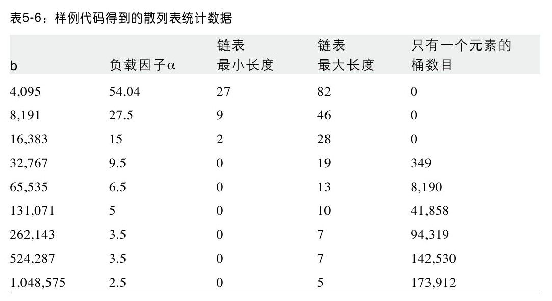 表5-6中给出了随着b增长,散列表的实际负载因子。注意当b足够大时,只有一个元素的桶数目变得越来越多,而且链表的最大长度也在下降。你可以看到当散列表的规模变得足够大时,查找的性能就是O(1)。