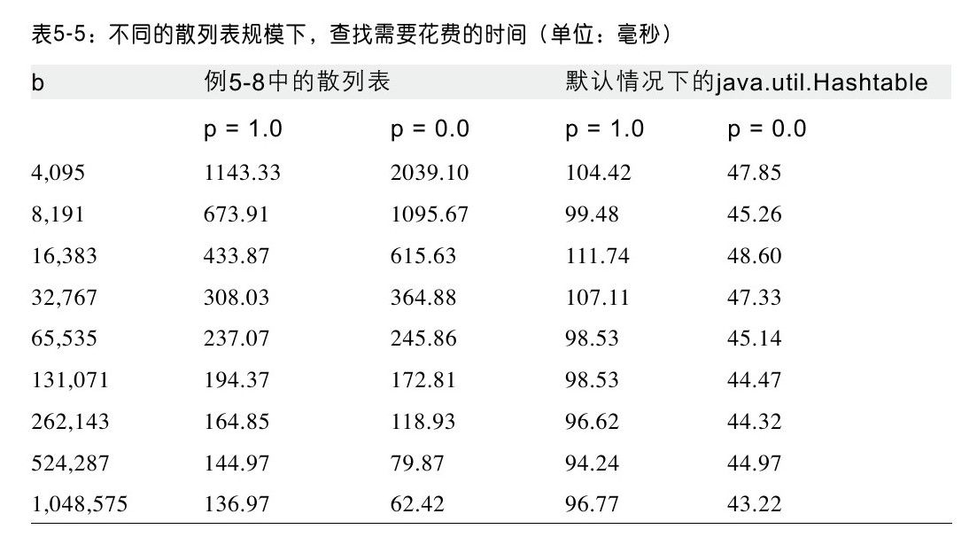 表5-5比较了例5-8的代码,它们都使用JDK类java.util.Hashtable,只是大小有不同而已。对于标有p=1.0的测试来说,213 557个单词中的每一个都会被用来作为目标元素。对于标记为p=0.0的测试来说,每一个单词都会用*来替换最后一个字符,以确保目标元素不会在表中。注意到我们在两种情况下都使用同样多的查找单词,确保散列的开销是相同的。我们进行了100次实验,并且抛弃掉最好和最坏的结果。表5-5表明了剩余98次实验的平均值。表5-6是我们在对散列表相关数据做的统计。随着负载因子的降低,链表的平均元素数量也下降了,这直接改善了性能。