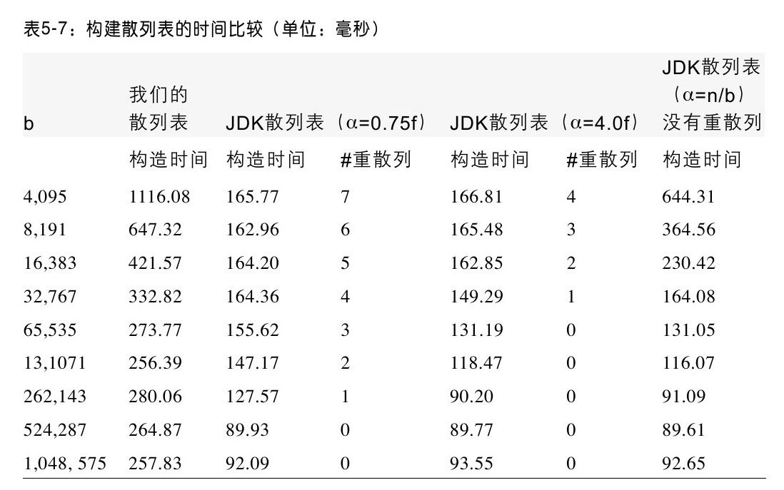已有的java.util.Hashtable类性能比我们的代码要优秀,但是随着散列表规模的增长,节省的时间越来越少。因为java.util.Hashtable对List类进行了优化,能够高效地管理元素链表。此外,当负载因子太高时,java.util.Hashtable自动地“重新散列”整个散列表;重散列策略将在接下来的“变种”一节中讨论。它将增加构造散列表的开销,但是改善了查找的性能。如果我们阻止使用“重散列”策略,那么java.util.Hashtable的查找性能将和我们的实现的性能差不多。表5-7给出了重散列的次数以及构造散列表的总时间的关系。我们从之前描述过的单词表中构造散列表,在进行了100次实验,抛弃最好和最坏的结果后,这个表是剩余98次实验结果的平均值。在构造散列表来改善性能时,这个类的设计者进行了一些额外的计算(做了一个很常见的权衡)。在表5-7的第3、5列,我们注意到当重散列发生时,有着很明显的性能开销。并且也发现最后两行没有进行重散列,所以在列3、5、7中的结果是差不多的。通过重新构建散列表,减少元素链表的平均长度,重散列的确改善了整体性能。