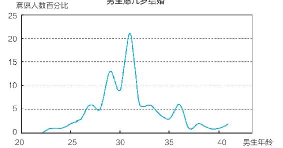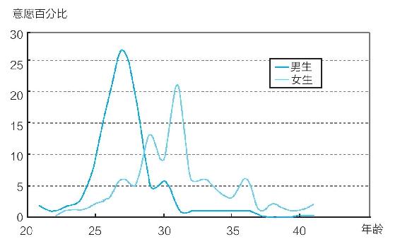 而男生却要到28岁,才会有更多的人想结婚;如果他们28岁没结婚,他们毫不介意拖到30岁;如果他们没有在30岁结婚,他们的意愿会持续走低;享受到人生35岁,才又有一个结婚意愿小峰值,如图9-4。